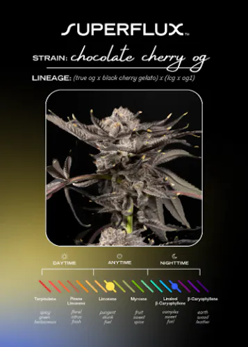 The Botanist Chocolate Cherry OG 3.5g flower is a potent indica strain that crosses (True OG x Black Cherry Gelato) with (LCG x OG1). With frosty purple buds and a flavor profile blending sweet cherry, chocolate, and earthy gas, Chocolate Cherry OG provides a deep, calming effect. This strain is ideal for relaxation, stress relief, and winding down in the evening or after a long day, making it perfect for nighttime use.