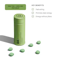 GO promotes natural energy through a blend of cannabis, caffeine, and three plant medicines. Swallowable pills with a rapid onset of 20 minutes. Vegan, calorie-free, sugar-free, and gluten-free. Each GO Drop contains 5mg THC and 5mg CBD.