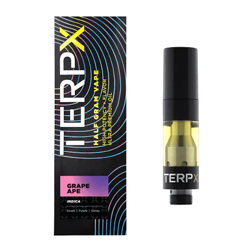 TerpX’s Grape Ape vape cartridge channels the full-bodied, relaxing character of this classic indica-dominant hybrid into a smooth, flavorful 0.5g format. Known for its dense purple buds and potent effects, Grape Ape offers a rich grape and berry aroma balanced with earthy and skunky undertones. This vape preserves the strain’s signature profile while delivering the calming, body-heavy high it’s loved for.