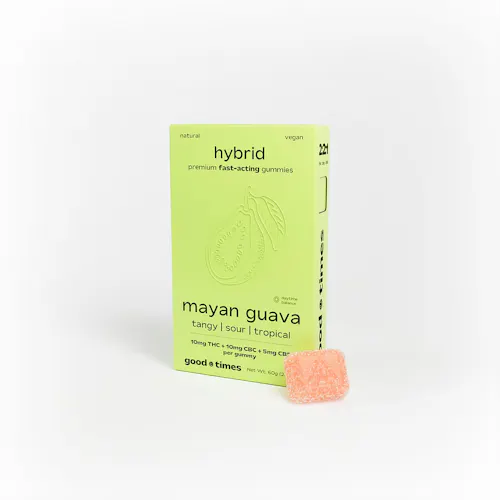 Good Times Mayan Guava gummies deliver a bold, tropical edible experience powered by a unique 2:2:1 THC:CBC:CBD ratio. This 10-pack features fast-acting technology designed to kick in within 15–30 minutes, offering a smoother and more predictable onset compared to traditional edibles. The combination of cannabinoids creates a balanced and functional effect profile, with THC providing a light lift, CBC supporting mood and clarity, and CBD helping to keep the experience calm and grounded. Vegan and gluten-free, these gummies are crafted for a clean, reliable, and enjoyable daytime experience.