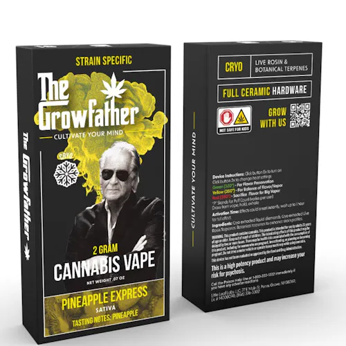 Growfather’s Pineapple Express Cryo Liquid Diamond Disposable puts an iconic strain into a powerful 2g device. Known as a cult-classic sativa-leaning hybrid, Pineapple Express blends energizing euphoria with creative spark, delivering a balanced high that’s as fun as it is functional. With juicy pineapple, mango sweetness, and a hint of pine, the flavor is tropical and refreshing. Cryo-extracted live rosin terpenes preserve the strain’s authentic profile, while liquid diamond infusion ensures heavy-hitting potency and smooth clouds. Premium ceramic hardware with an LCD puff counter and multiple heat settings makes this disposable as advanced as it is flavorful.