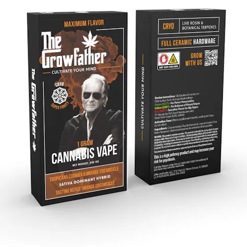 Growfather’s Tropical Cookies x Orange Creamsicle Cryo Disposable brings nostalgic flavor and sativa-dominant energy in a sleek 1g device. A cross of Tropicanna Cookies and Orange Creamsicle, this strain fuses zesty citrus with smooth, creamy dessert notes for a flavor that tastes just like a summer creamsicle. Infused with live rosin and botanical terpenes, the vape delivers rich, authentic taste and elevated effects. Powered by full ceramic hardware for clean, metal-free hits, this disposable offers both quality and convenience in one.